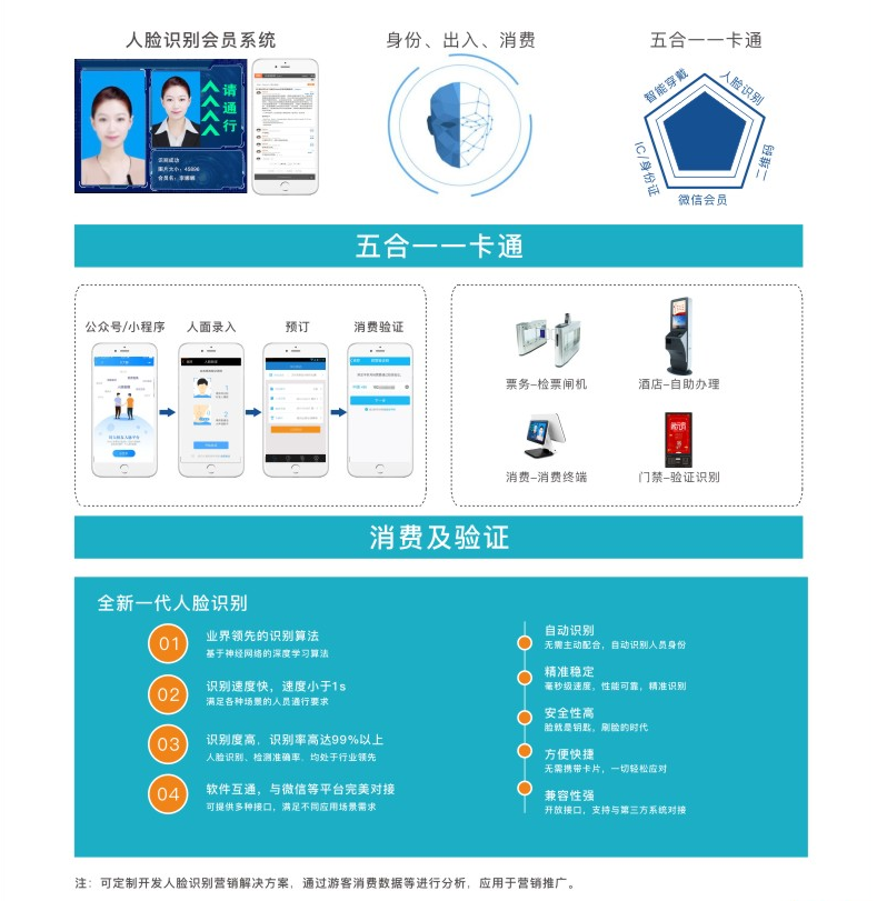 人脸识别是基于人的面部几何特征、相对位置、皮肤纹路、活体检测等信息进行身份识别的一种生物识别技术。启明芯人脸识别会员系统基于人脸智能分析技术研发的用于会员营销的解决方案、提升消费者个性化、便利化、情感化消费体验,联动会员信息。可提供人脸1:1比对、人脸1:N识别、人证核对、活体检测等功能,满足VIP会员年卡、员工卡、多次入园票的识别验证;包括人脸识别、人脸认证、人脸库管理(如人脸注册、人脸更新、人脸删除、用户信息查询、组列表查询、组内用户列表查询、组间复制用户、组内删除用户)等功能应用,充分满足运营管理的需求。